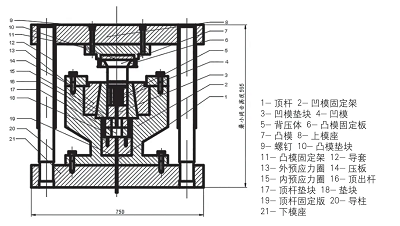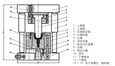 鐘形罩?jǐn)D壓成形需要四套模具,各擠壓步驟模具結(jié)構(gòu)除凸凹模外基本相同。反擠壓是保證零件的尺寸精度和表面粗糙度的關(guān)鍵,擠壓時模具要承受一定的高壓,所以對反擠壓模具要求較高,設(shè)計(jì)圖如圖14所示。