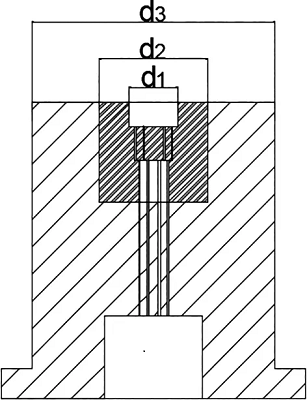 根據(jù)仿真結(jié)果開展模具設(shè)計(jì),具體分為凸模設(shè)計(jì)、凹模設(shè)計(jì)(圖11)及模具裝配(圖12)。凹模內(nèi)壁承受的單位應(yīng)力很高,因此采用兩層組合凹模的方法。組合凹模材料選用45號鋼,可以顯著提高凹模承載能力,防止模具縱向開裂。